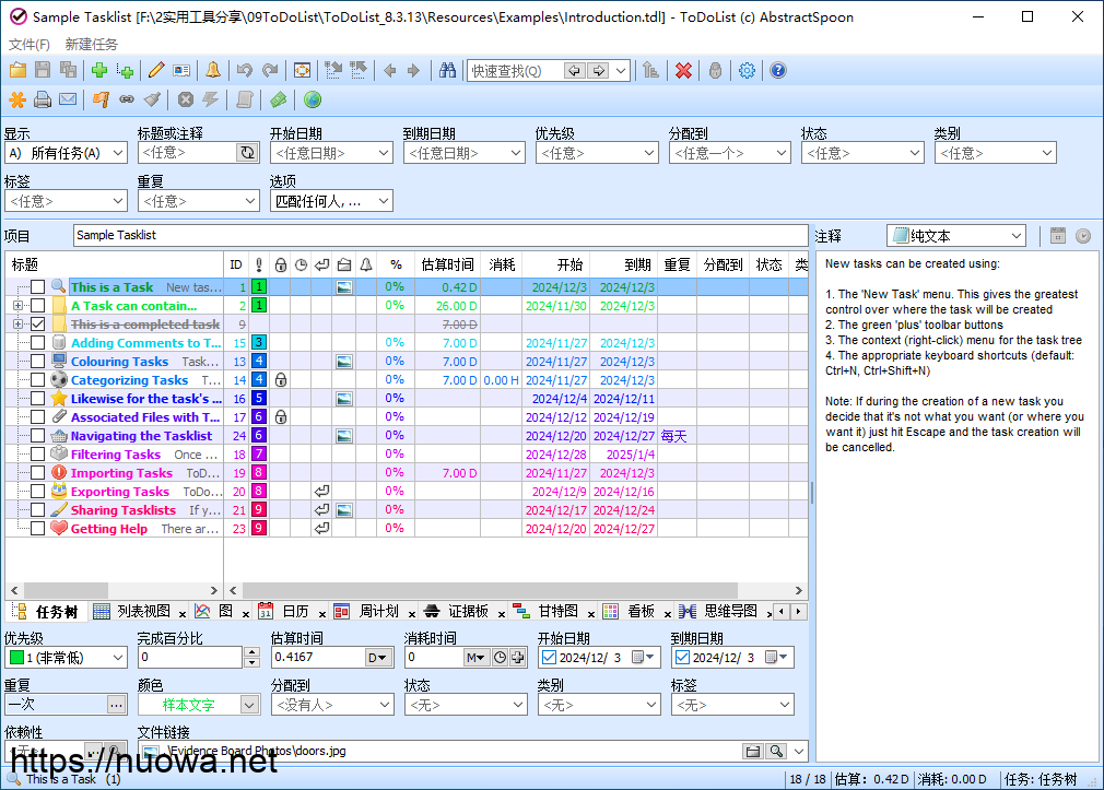 ToDoList 与大多数其他任务管理软件包的不同之处在于,它能够创建任务层次结构,将复杂的任务逐步分解为更简单的子任务,直到不再需要进一步简化为止。每个子任务都可以安排开始和结束日期、优先级和其他各种属性。每个子任务完成后,父任务会以各种方式更新,让您随时了解总体进度。任务列表还可以打印或保存为其他各种格式,以供显示和报告。