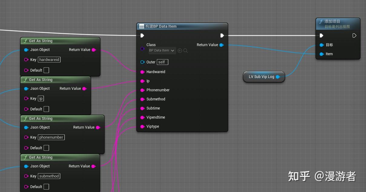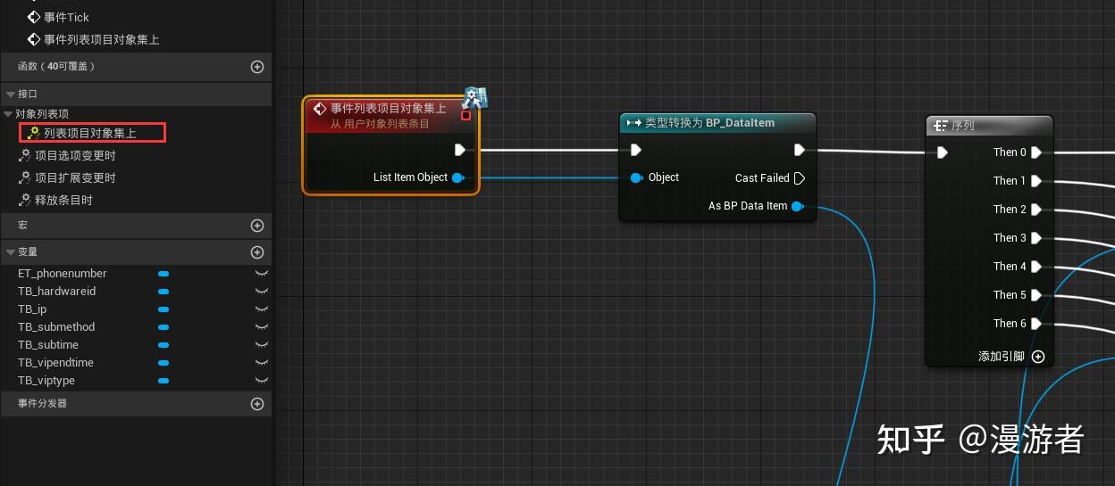 然后在SubLog_UserWidget控件里打开事件图表,双击【列表项目对象集上】将事件添加到事件图表中,添加BP_DataItem的类型转换,将BP_DataItem获取到的变量值赋值给SubLog_UserWidget里对应的控件文本上。