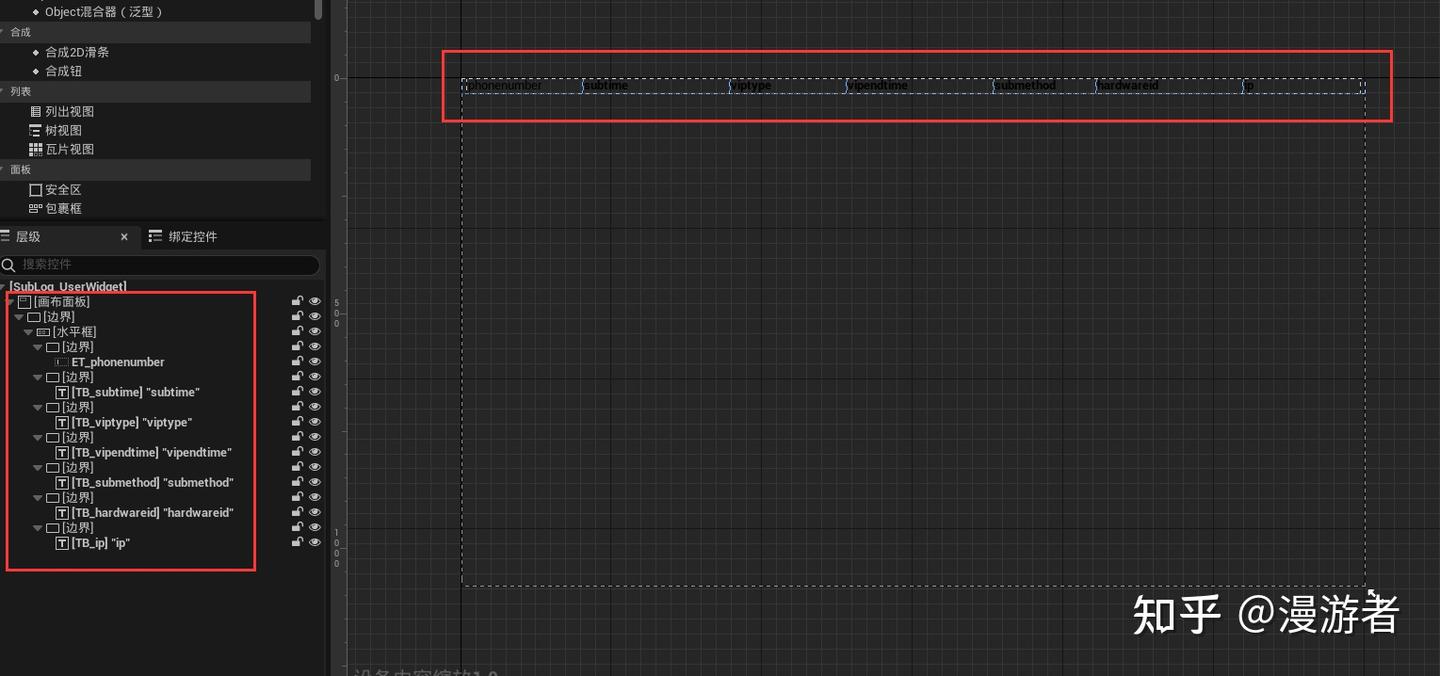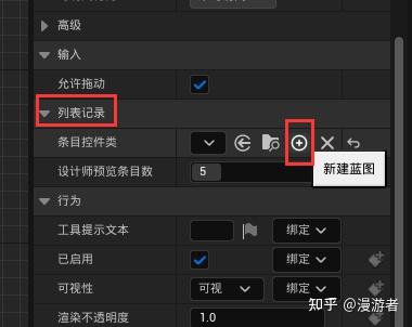 在你的控件蓝图里添加控件ListView(列出视图),在控件细节里找到【列表记录】,然后点击【条目控件类】后面的+号,添加一个控件,这个就是表格单行数据的显示效果,这个新生成的用户控件我这里命名为:SubLog_UserWidget,
