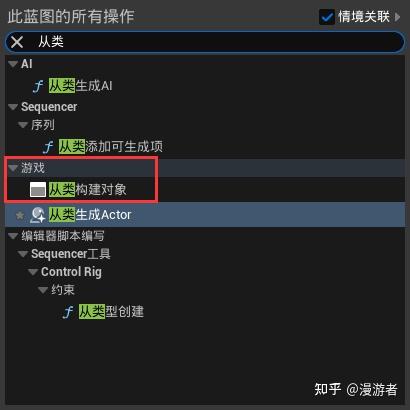 再去主控件蓝图里设置数据库数据的获取显示,通过添加节点【从类构建对象】来创建表格每一行最终要显示的数据库里的具体数据