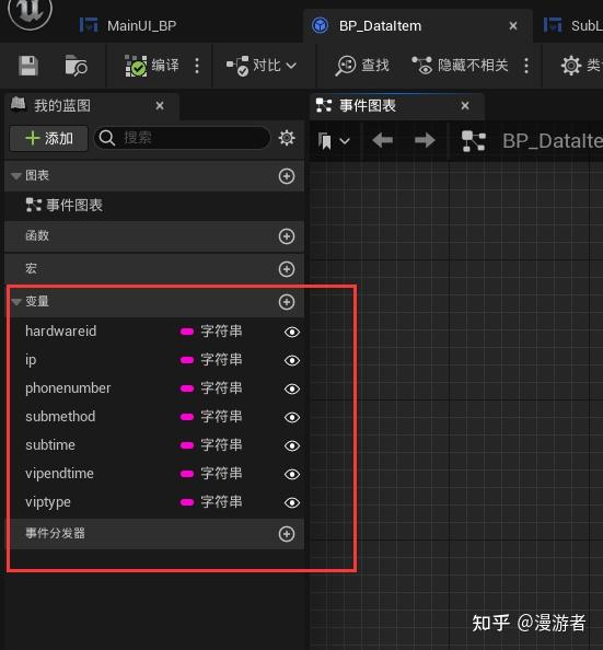 添加一些变量,变量要设置成公开及可编辑。这些变量内容与上面的SubLog_UserWidget设置的每列数据是对应的。