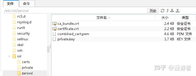将下载的zip文件解压,得到三个文件,证书文件、私钥、中间文件,上传到服务器/etc/ssl/zerossl文件夹内