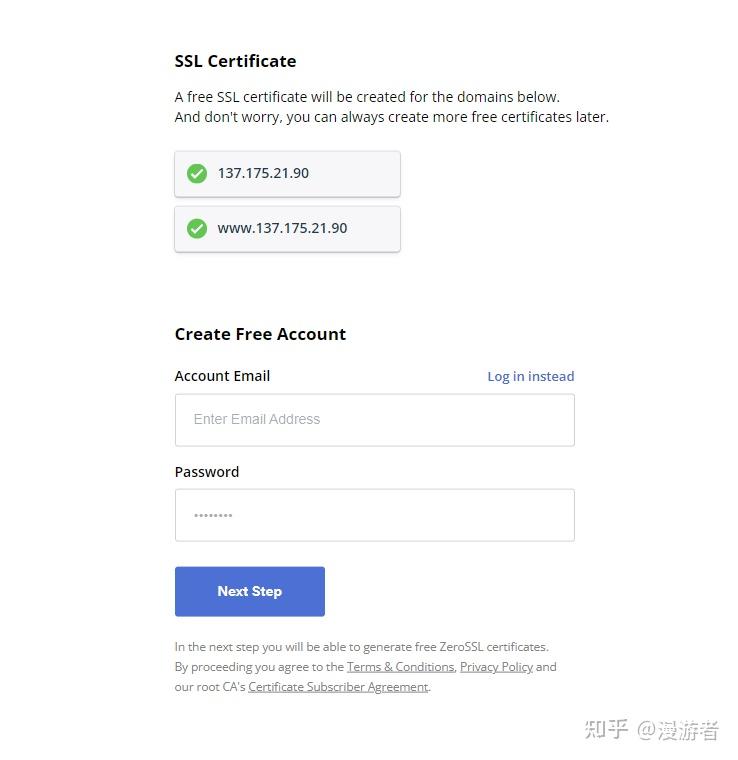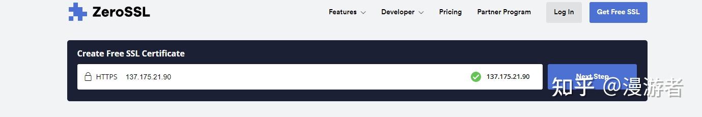 上面的方法只是实现了https的加密访问方式,但在有些情况下某些软件可能不支持这类自签名SSL证书,比如UE5,下面以zerossl.com为例为IP申请免费SSL证书,打开网站输入IP地址,点击下一步