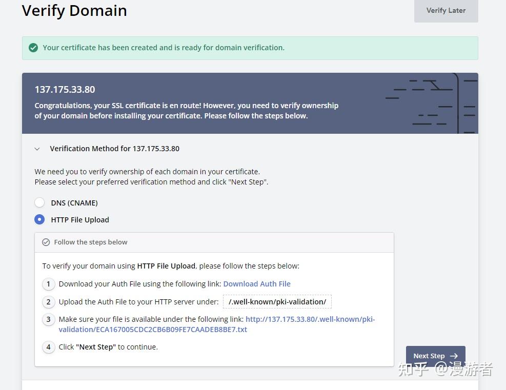 接着操作到验证地址这一步,我们没有域名,所以选择下载文件验证,点击Download Auth File按钮将txt文件下载到电脑上