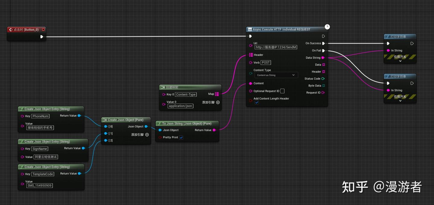 打开UE5编写代码蓝图节点,由于服务器接收的是JSON格式的数据,所以要先构建待发送的JSON数据,主要是PhoneNum待接收短信的手机号,SignName短信签名名称,阿里云后台你设置的内容,TemplateCode短信模板 Code,也是阿里云后台你设置的内容。这里使用http请求,请求连接为http://你的服务器IP:1234,请求成功后服务器会返回JSON格式的字符串如:{“BizId”:”05108674083612^0″,”Code”:”OK”,”Message”:”OK”,”RequestId”:”B54ED-5AB6-5737-85E1-1B363F8E27″,”authCode”:”7724″},内容包括Code:请求状态码,如OK,authCode:短信验证码,4位数字,你可以解析从服务器收到的JSON字符串,提取出code和authCode值来检测是否成功发送短信,以及验证用户朝软件里输入验证码是否正确,