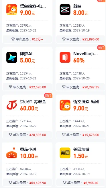 大量热门优质项目如:短剧项目、网盘项目、小说项目、搜索项目等,如果你还没有什么好的项目可做,那任推邦平台绝对值得一试,绝对实打实的让你能变现。大部分项目都是周结,结算后可随时申请提现。努力一下的话每月额外增加个几千收入没问题,大神没有上限。