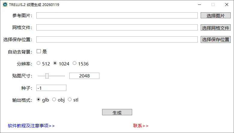 如果是想将图片转成3D文件的话,就运行图片转3D.exe。如果是想对3D网格文件生成纹理材质的话就运行纹理生成.exe。