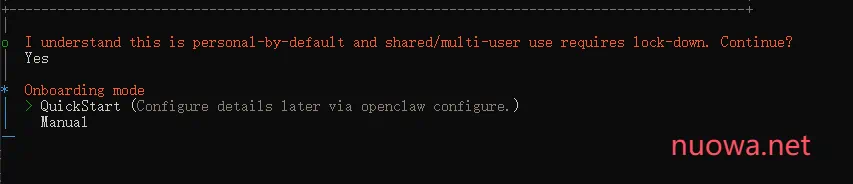 然后选择Onboarding mode,有OpenAI等官方API或以前配置过API环境变量的话,可以选择QuickStart,这里以Manual模式演示。选择第二个Manual,回车