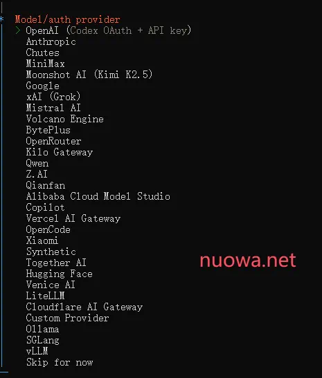 设置Model/auth provider,选择倒数第五个Custom Provider,回车