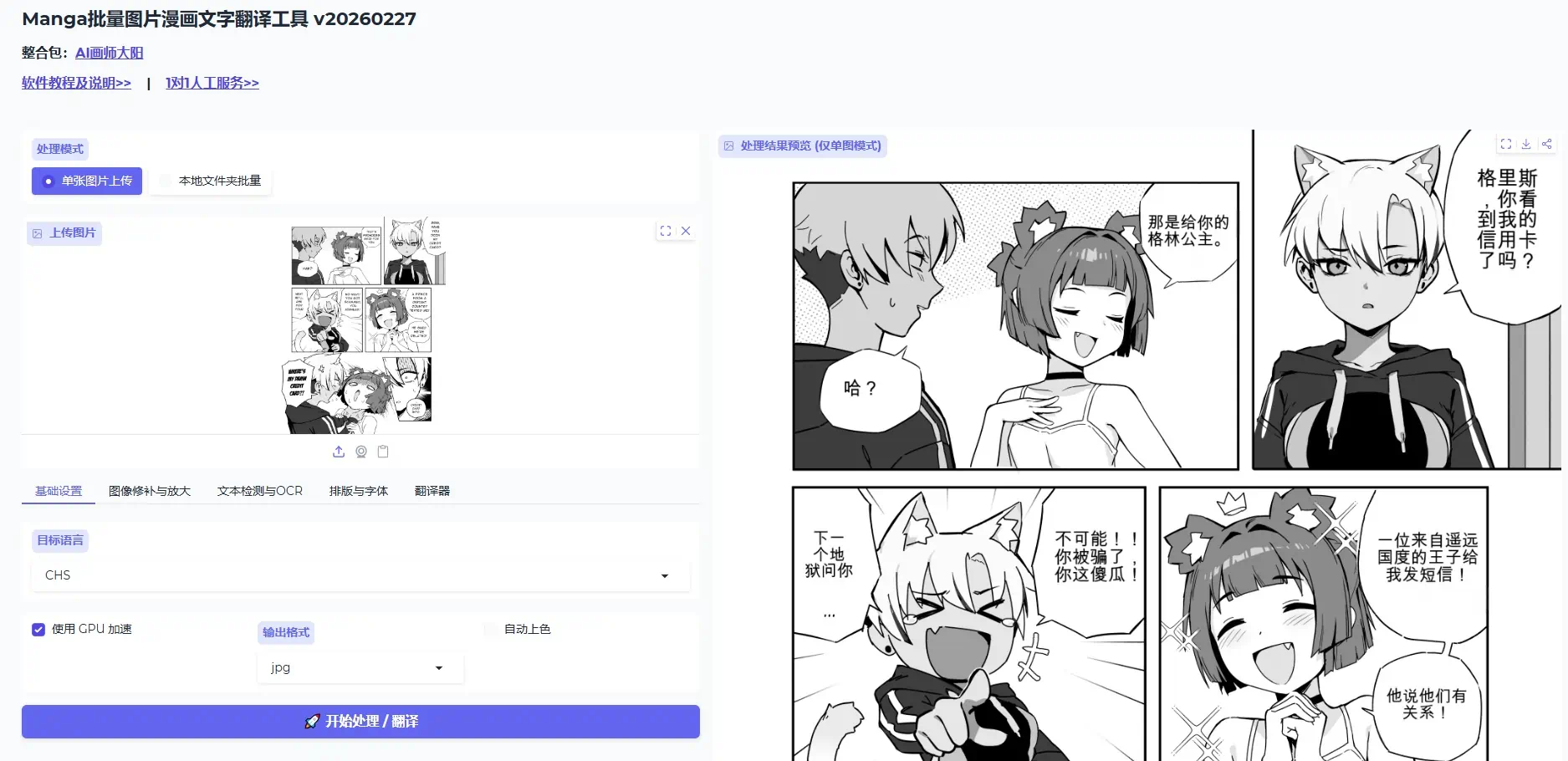 manga-image-translator可一键翻译各类图片内文字,可用于漫画翻译,这个软件可以批量将日文漫画英文漫画等一键翻译成中文漫画,也可以翻译成其它语言的漫画,支持几十种语言互翻,翻译后效果非常好,新语言文字画面毫无违和感,简单高效,为方便操作我制作了一个带UI界面的整合包,UI操作界面如下: