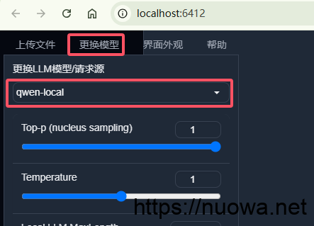 打开config.py文件,将35行左右的代码,AVAIL_LLM_MODELS内增加”qwen-local”,添加这一项的话在webUI中就可以选择本地大语言模型,