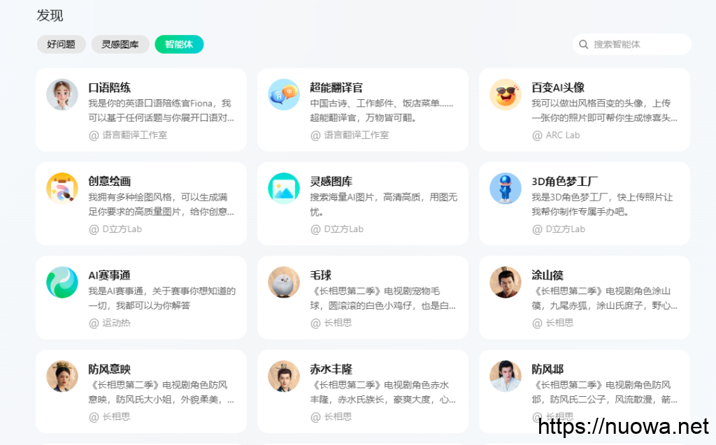 智能体中可以选择让腾讯元宝扮演多种角色,来完成指定任务,如口语陪练,翻译,赛事解说,ppt设计,文案写作,写宣传稿等几十项详细功能。